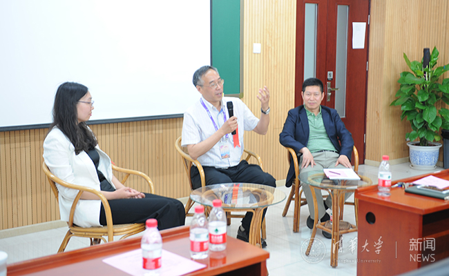 左起为:那娜、邓力和王奎与学生交流。 刘储浩 摄