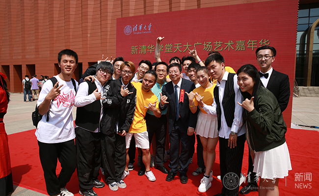 邱勇校长与参加校庆“嘉年华”的同学们合影。苑洁 摄
