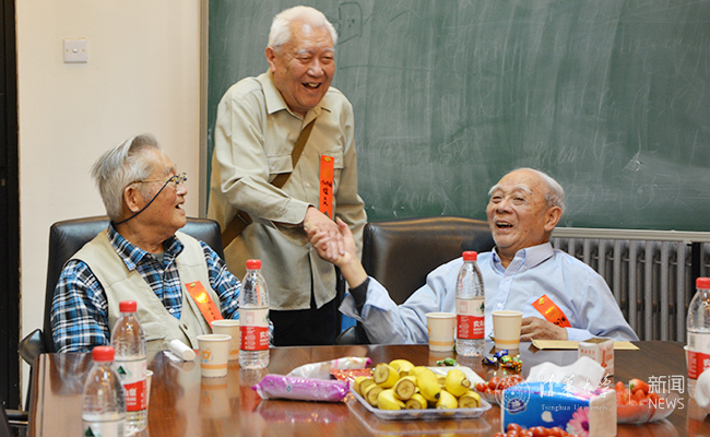 毕业50周年校友共同佩戴纪念章合影。杨帆 摄