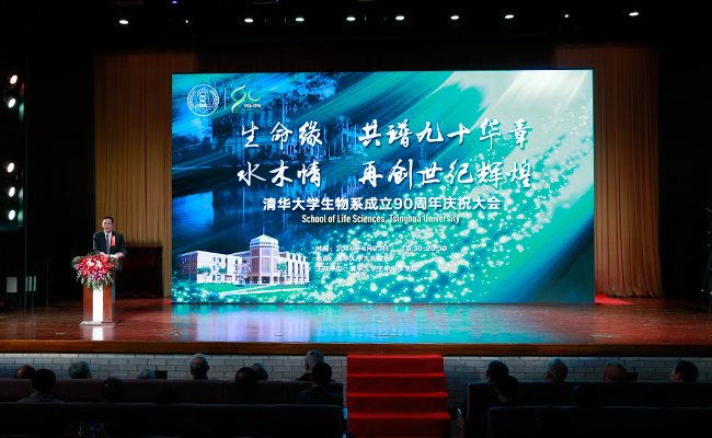 施一公代表学校向生物系成立90周年致以热烈祝贺。他说,清华大学生命学院发展到今天是几代清华人呕心沥血、甘苦与共的结果,他向各位对清华生命学科作出贡献的前辈们表示最崇高的敬意和最诚挚的感谢。在回顾从生物系最初成立到今天共同走过90年艰难而辉煌的历程后,施一公表示,如今生命学院的综合实力逐步增强,开始在中国乃至世界生命学科领域崭露头角。我们要勇于面对这样的机遇和挑战,全力以赴、勇担重任,为中华民族伟大复兴的“中国梦”贡献力量,为世界文明的进步作出自己应有的贡献。