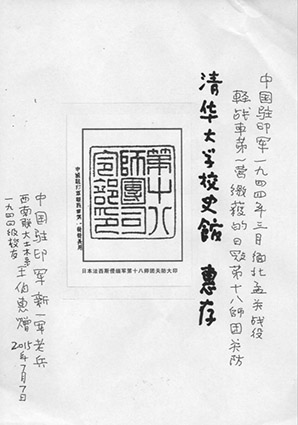 清华新闻网8月24日电(通讯员 李 珍)在纪念中国人民抗日战争暨世界反法西斯战争胜利70周年之际,原孙立人和齐学启将军的部下、西南联大土木系1944级校友王伯惠向清华大学校史馆赠送了他当年参加抗战时保存的珍贵纪念物──中国驻印军在1944年3月缅北孟关战役中缴获的日本法西斯侵缅军第十八师团关防大印的复印件。
