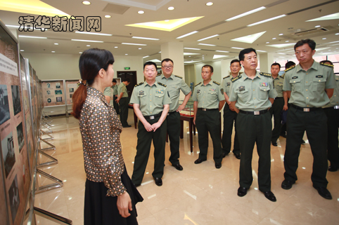 来清华指导新生军训的解放军防化学院首长和部分教官,在校领导陪同下参观了抗战展览。
