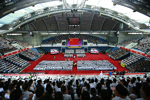 清华新闻网8月20日电(记者 王 蕾)8月20日上午,清华大学2015级本科生新生开学典礼在综合体育馆举行。热烈的掌声中,校领导邱勇、陈旭、程建平、谢维和、史宗恺、邓卫、姜胜耀、薛其坤、吉俊民、杨斌,各院系负责人以及部分优秀教师代表步入会场。现场3300余名2015级本科新生大多穿着各自院系特色的文化衫参加了开学典礼。部分新生家长、亲友在现场见证了这一特殊的时刻。典礼由副校长、教务长杨斌主持。
