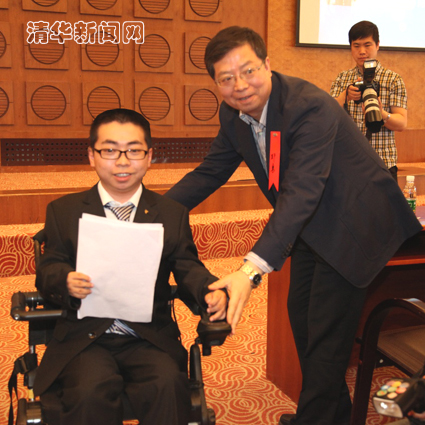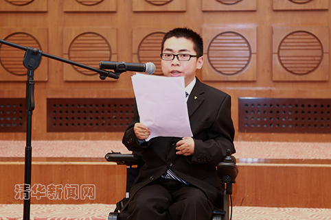 计算机系2012级本科生矣晓沅同学作为学生代表发言。矣晓沅六岁时患类风湿性关节炎,身体关节变形,从此只能终生与轮椅为伴。但他自强不息,以优异的成绩进入清华大学,通过自己的努力改变命运。他回忆了自己求学的艰难历程,也向大家介绍了自己在清华园里的生活,向所有帮助过自己的亲人、老师、朋友、同学们表示了的感谢。“或许我们的世界曾经充满黑暗,但关怀与帮助是一支火炬,我们从各位学长的手中接过了它,照亮了我们小小的一方天地。那么,即使再难,我们也愿将这支火炬继续燃烧并传递下去,总有一天,星星点点的火光将会驱散黑暗。”