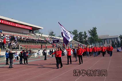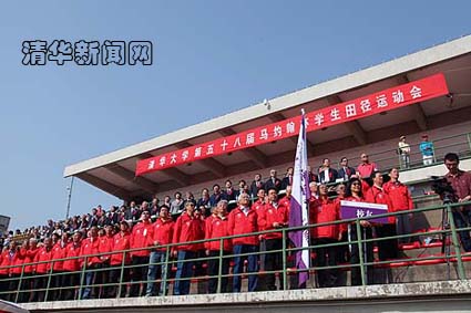 清华新闻网4月26日电 (通讯员 解红岩)4月26日上午,校庆日的清华东操彩旗招展,乐声阵阵,一年一度的马约翰杯运动会开幕式正在举行。在数十个学生方阵通过之后,由99位校友组成的校友方阵,身穿火红的队服,在全场热烈的欢呼声中健步走来。