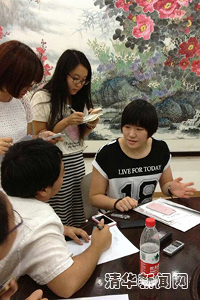 迎新现场,奥运游泳冠军叶诗文的出现吸引了很多人的目光,今年她以应届生身份被清华大学法学院录取。谈到对清华的第一印象,叶诗文惊叹“清华好大”。“我觉得我需要一辆清华自行车”,她笑着说。面对即将到来的仁川亚运会,叶诗文正加紧训练,她充满信心地说自己要“努力给清华一个世界纪录!”尽管国家队的训练异常紧张,叶诗文还是希望能够利用宝贵的时间抓紧读书,“争取四年后在这里毕业!”