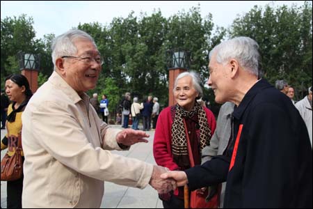 讲到同学们无私奉献的工作经历与“反右”的时代背景下遭受的不公待遇,年过八旬的杨德麟老人不禁潸然。她最后说,1954届校友始终难忘母校的培育,难忘师长的谆谆教诲,也难忘同窗的手足情谊。