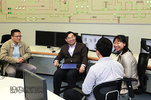 图为胡和平与高温气冷堆核电站示范工程模拟控制室青年教师进行交流。记者 郭海军