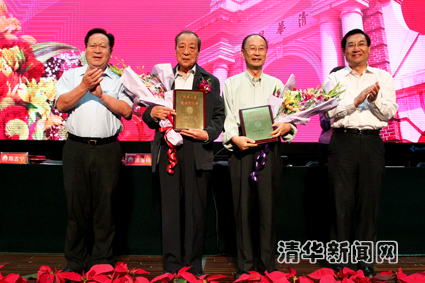 图为李学勤教授(左二)荣获2011年度“清华大学突出贡献奖”。记者 郭海军 摄