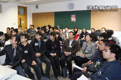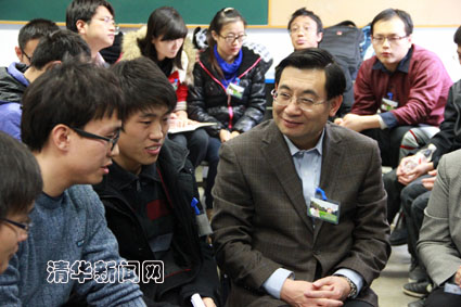 清华新闻网11月26日电 党的十八大召开之后,清华大学广大学生高度关注大会,认真学习党的十八大精神。为将党的十八大精神的学习不断引向深入,发挥党建带团建的作用,11月22日,党委学生部、研究生工作部和校团委在第三教学楼等地联合举行“学习党的十八大精神党团支部1+1集中组织生活”。校党委书记胡和平、校党委副书记史宗恺,以及来自学校有关职能部门负责人、院系负责人、马克思主义学院教师深入到同学中间,与大家一同学习、交流学习党的十八大精神的体会和收获。全校58个本科生党、团支部和60余个研究生党团支部,近2000名同学参加了集中学习活动。