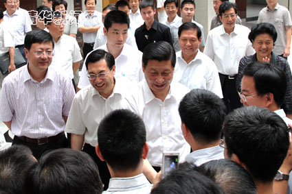 清华新闻网6月20日电(记者 周襄楠 李含 刘蔚如 程曦 高原 实习记者 赵姝婧)6月的清华园,草木葱郁,生机盎然。19~20日,中共中央政治局常委、中央书记处书记、国家副主席习近平来到清华大学视察工作,并与师生进行了深入交流。中共中央政治局委员、北京市委书记刘淇,中共中央政治局委员、国务委员刘延东,教育部党组书记、部长袁贵仁,北京市委副书记、市长郭金龙和清华大学校长陈吉宁、党委书记胡和平陪同视察。