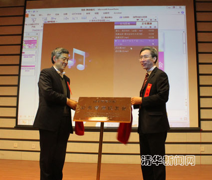 图为郭樑(右)与薛澜共同为公共管理校友会揭牌。
