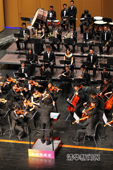 图为清华大学101周年校庆校友招待音乐会上学生交响乐团演奏。研通社记者 王皓冉 摄