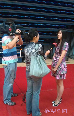 图为章泽天在清华大学迎新现场接受媒体采访。 通讯员 杨 帆 摄