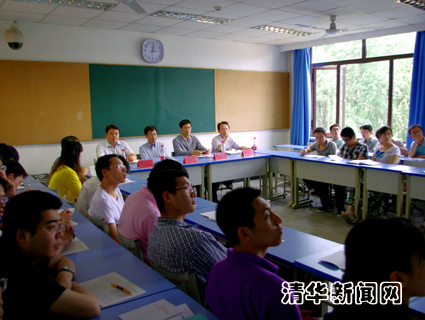 清华新闻网5月22日电 (研通社记者 孔令营 蒋中铭 王东 王芳)5月19日,以“传承百年精神 争当时代先锋”为主题的清华大学研究生集中主题党日活动在第三教学楼举行,来自全校各院系优秀研究生党支部围绕胡锦涛总书记在庆祝清华大学建校100周年大会上的重要讲话开展了形式丰富的主题党日活动。清华大学党委副书记史宗恺以及党委宣传部、党委研究生工作部、部分院系负责人、“良师益友”、退休教师等40余位教师来到支部中间,和同学们一起交流思想、学习讨论。