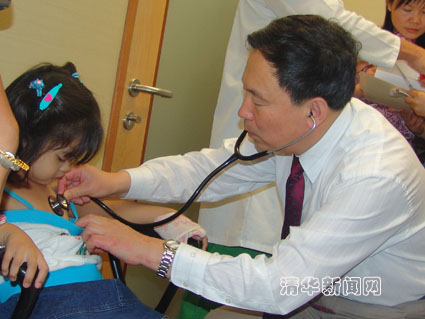 图为吴清玉在菲律宾为先天性心脏病患儿做检查。