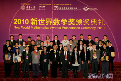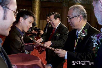 【新闻中心讯 记者 吕露英 摄影 郭海军】12月17日晚,由清华大学主办的2010新世界数学奖颁奖典礼在北京饭店举行。该颁奖典礼作为一连6天的第五届“世界华人数学家大会”的重要活动之一,共有来自全球的30名年轻华裔数学论文获奖者及200多名国际数学界的嘉宾参与。来自哈佛大学的齐震宇、巴黎南大学的胡永泉、斯坦福大学的曾于容、普林斯顿大学的尹骏获得博士论文金奖,来自浙江大学的刘伟华、台湾大学的王赐圣获得硕士论文金奖,来自香港中文大学的许向山、林嘉杰和来自清华大学的赵亮获得学士论文金奖。新世界数学奖综合评审委员会主席、清华大学数学科学中心主任丘成桐教授,新世界集团代表郑志雯女士,清华大学校长顾秉林出席颁奖典礼并致辞。清华大学常务副书记陈旭,教育基金会副理事长、原常务副校长杨家庆也出席了典礼。