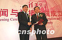 清华大学新闻与传播学院成立大会二十一日在北京清华大学隆重举行,学院将接受国家有关部门及重要新闻机构的委托,为其管理骨干提供高级培训。图为清华大学校长王大中(左)在为出任首届院长的范敬宜(右)颁发证书。中新社记者 张勤 摄