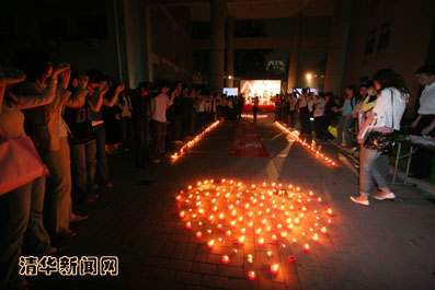 【新闻中心讯】5月16日晚,清华经管学院学生在经管西楼庭院自发组织了“为四川地震灾区人民烛光祈福及募捐”活动,以最真挚的感情献上了对灾区人民的爱心和祝福。清华大学党委学生部部长杜汇良、经管学院党委书记杨斌、院党委副书记朱岩等负责同志和同学们一起参加了本次活动。