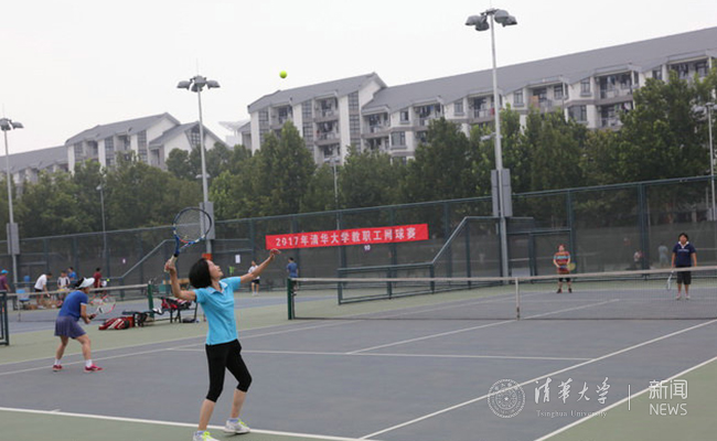 2017年参加校教职工网球赛(穿蓝色运动服为杨巾农)。