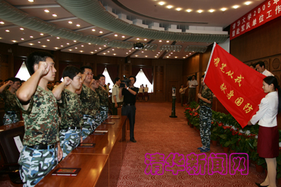 【新闻中心讯 通讯员 祁金利 摄影 郭海军】“我志愿献身国防事业,忠于中国共产党的领导,忠于祖国,忠于人民,忠于军队,服从命令,严守纪律,勤奋工作,为强我国防而努力奋斗!”7月12日下午,我校第二届国防生毕业典礼暨到军队单位工作毕业生出征仪式在我校主楼接待厅隆重举行,63名国防生毕业生和18名即将奔赴军队单位工作的非国防定向生,面对鲜艳的红旗,庄严宣誓。