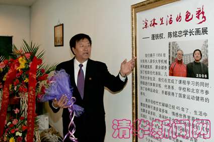 揭幕式上,蓬铁权、陈铭忠学长激动地说:“我们俩于1956年分别考入清华大学机械系和建筑系,都参加了校田径代表队。几年的大学生活,我们在完成了课程学习的同时,积极进行体育训练,代表系、学校和北京市参加了各种运动会,并都获得了国家运动健将的称号。今天我们回到离别近半个世纪的母校,回到哺育我们成长的摇篮。在这里让我们用自己涂抹的色彩,与同窗学友一起来祝贺和赞颂亲爱的母校九十五岁华诞吧!”