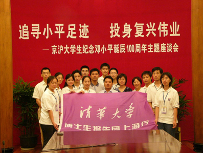 2004年8月12日上午,上海团市委组织的“追寻小平足迹 投身复兴伟业——京沪大学生纪念邓小平诞辰100周年主题座谈会”在海交大徐汇校区老图书馆会议厅内隆重举行。清华大学博士生报告团上海支队的12名同学参与了这次京沪两地大学生共话伟人的活动,深切缅怀小平同志的人生历程,深入领会邓小平思想实质。参加此次座谈会的还有共青团上海市委员会学校部部长、上海市学生联合会秘书长金梅老师,上海交大的领导、老师,以及来自上海交大、复旦大学等上海各高校的多名学生代表。