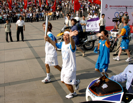 【新闻中心讯 记者 周襄楠 摄影 郭海军】“羽·泉!羽·泉!”从羽·泉在清华大学主楼前接到火炬开始,羽·泉就成为人们疯狂追逐的焦点。两个人染成的黄头发,在蓝白相间的火炬手的服装的映衬下分外显眼,他们一在主楼前下车就向大家挥手,引得周围的同学尖叫、大喊:“羽·泉!羽·泉!”