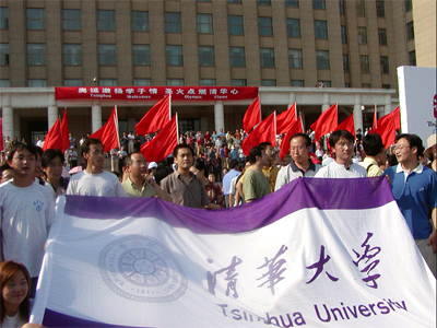 千龙体育6月10日讯(记者于振华)2004雅典奥运火炬北京接力活动6月9日上午9点在人民大会堂东门外广场开始,将经过148名火炬手传递55公里到达终点颐和园。图为:清华大学万名师生在该校主楼前迎接奥运圣火。