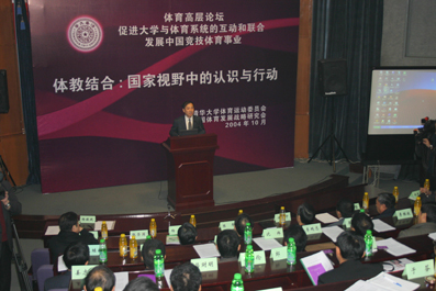我校校务委员会副主任、校体委主任郑燕康致欢迎词。国家体育总局局长助理冯建中、大学生体育学会秘书长杨立国在论坛开幕式上分别做了发言,指出体教结合是体育界和教育部门必须重视和大力推进的带有方向性的一项事业;中国的体育要全面发展,就要转变观念,重视教育,树立正确的人才观;要把大学办的运动队作为国家队或者二队、三队,可以代表国家出国比赛,重大赛事要有大学的管理者、运动员参加;体育和教育资源的重新配置可以产生跨越式的发展;体教结合要在政策和体制上加以研究,要鼓励有条件的大学办高水平的运动队,各部门应该给予支持和配合。