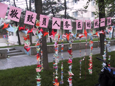 在南北主干道的两侧,记者看到,在两条长长的丝带上系满了五颜六色的千纸鹤,一个个随风飘舞,在道路两旁,挤满了准备在千纸鹤上留言、签名的清华学生。这是清华大学紫荆志愿者总队和爱心协会发起的“千纸鹤行动”,希望每个人都来折一个小小的千纸鹤,以表达所有清华学生对于辛勤工作在治疗“非典”一线的医护人员的敬意和祝福。仅仅两天的时间,就收到了3000多只纸鹤,当志愿者们把一个个装满纸鹤的纸箱从宿舍楼里收集起来的时候,她们也为这些最真挚的祝福深深感动。