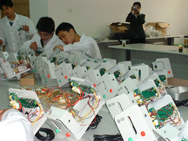 从5月1日下午接到学校有关开辟生产基地的指示,在深圳清华大学研究院科研人员、北京清华力合电子技术有限公司与清华大学企业集团的通力合作下,成立了生产指挥部,根据深圳的生产经验,设计好生产流程,经过了48小时的日夜奋战建成了清华校内生产基地。目前,该基地一片忙碌的生产景象,120名工作人员正在全力投入生产中。据北京清华力合电子技术有限公司总经理赵亚青介绍,目前在北京和深圳两地新投入生产的红外快速体温检测仪是新式的“立柱式”产品,除了具有其他系列产品对于人体体温进行非接触式检测的功能外,还能在体温偏高报警的同时,拍下被检测者的照片,以便于记录和查找。