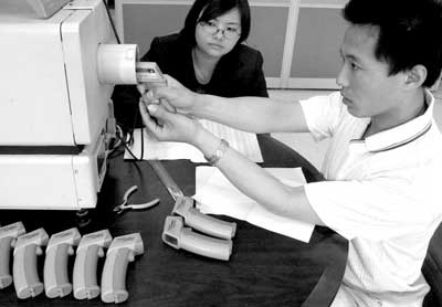 5月13日,清华大学红外快速体温检测仪的研发人员在检测即将出厂的便携式红外快速体温检测仪。为满足防控非典的需要,清华大学新建的红外快速体温检测仪生产线当日投产。清华大学研制的红外快速体温检测仪能够快速检测流动人员中的发热者。