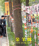 昨天是清华大学校庆日,清华大学南北主干道两旁的白杨树上挂满了纸鹤,以此表达对奋战在抗击非典一线医务人员的敬意。这次活动是由清华大学学生社团自发组织的。