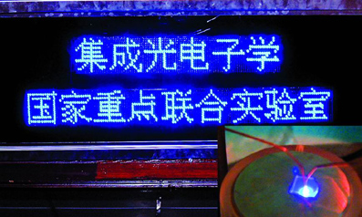 蓝光二极管电注入发光时色彩艳丽,右下角为单个蓝光二极管的发光照片