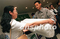 四日,是北京清华大学二00二年本科新生入学报到日,该校为家庭经济困难学生特设立了“绿色通道”。来自山西吕凉地区的贫困生王志立(右)正在接受学校捐赠的生活用品。作者:张勤