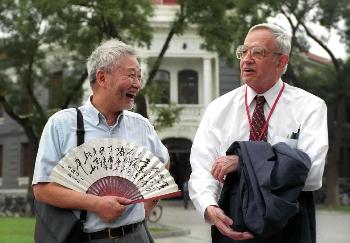 8月27日,清华大学周培源应用数学研究中心主任谢定裕教授(左)陪同诺贝尔经济学奖获得者纳什参观清华园。纳什被认为是一位数学天才,他在21岁时就提出了纳什均衡理论,后来成为博弈论的两大基础之一。电影《美丽心灵》就是根据纳什的传奇经历改编的。