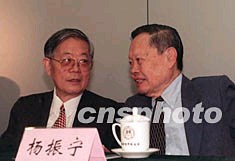北京清华大学“前沿科学国际研讨会”十七日在北京开幕,包括十三位诺贝尔奖得主在内的数百名海内外科学家和学者出席此次盛会。图为著名理论物理学家、诺贝尔奖获得者杨振宁(右)和中国科学院院士、大会主席周光召(左)在会上交谈。作者:张勤