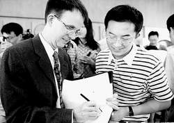 6月17日,在清华大学举办的“前沿科学国际研讨会”上,清华学子与四位诺贝尔物理学奖获得者进行了面对面的交流。大师们的人生经历和科学历程使学子们从中得到启迪。图为年轻的诺贝尔物理学奖获得者康奈尔(左)在为清华学子签名。