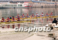 美国耶鲁大学赛艇选手二十三日在北京“首届世界名校赛艇对抗赛”上获得冠军(右上),北京清华大学队获得了亚军。此比赛是在北京密运河颐和园至八一湖水段举行的。中新社图 郑瑞德 摄