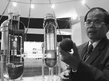 在历博展出的《今日清华》,清华大学林登彩教授在他主持设计的10兆瓦高温气冷实验堆前,手握一个球形燃料元件为每一位参观者做细致的讲解。林教授介绍说,高温气冷堆是第三代核能发电装置,由于技术较复杂,怕观众不好理解,所以特意来展会现场做讲解员。白继开 摄