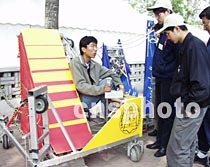 北京清华大学自动化系的三名学生制作的“踢足球机器人”,获NHK国际大学生机器人比赛第三名。二十六日该机器人在清华大学第十九届“挑战杯”学生课外学术科技作品展览上展出。中新社记者 张勤 摄