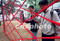 北京清华大学美术学院学生二十七日在校园教学区布置清华建校九十周年庆典,学生与教师自制礼品悬挂彩廊,迎接二十九日的校庆日到来。中新社记者 张勤 摄