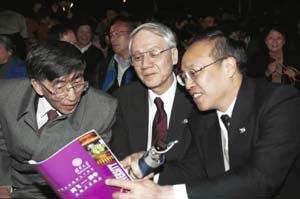 图为清华大学校长王大中和台湾新竹“ 清华大学”校长刘炯朗(中)在一起。 4月29日,清华大学师生同台演出《腾飞--清华》大型文艺晚会,庆祝清华大学建校90周年。