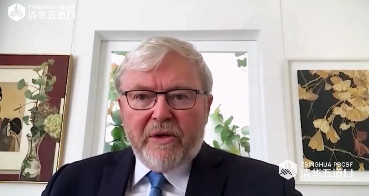 围绕“变局下的全球经济治理”,清华大学国家金融研究院院长、国际货币基金组织原副总裁朱民发表了主旨演讲,澳大利亚前总理陆克文也就此主题分享了观点并与朱民展开讨论。