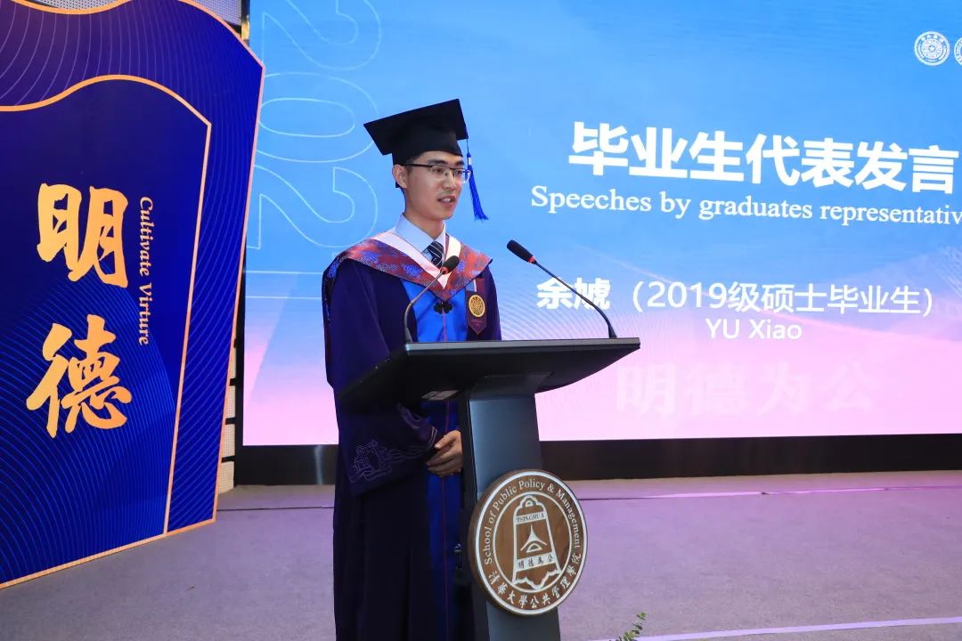 毕业生代表余虓在毕业典礼现场发言。回顾两年学业、社工、校友交流的经历,余虓觉得一切都是最美好的安排。“自强不息、厚德载物”,他感谢清华教会了自己君子之道的品格与意涵;“明德修远,为公致新”,他感谢学院培养了自己以国家发展、人类进步为使命的公共精神。毕业后,他选择成为一名地方选调生,希望在为人民服务的实践中践行和坚守清华公管人的使命。