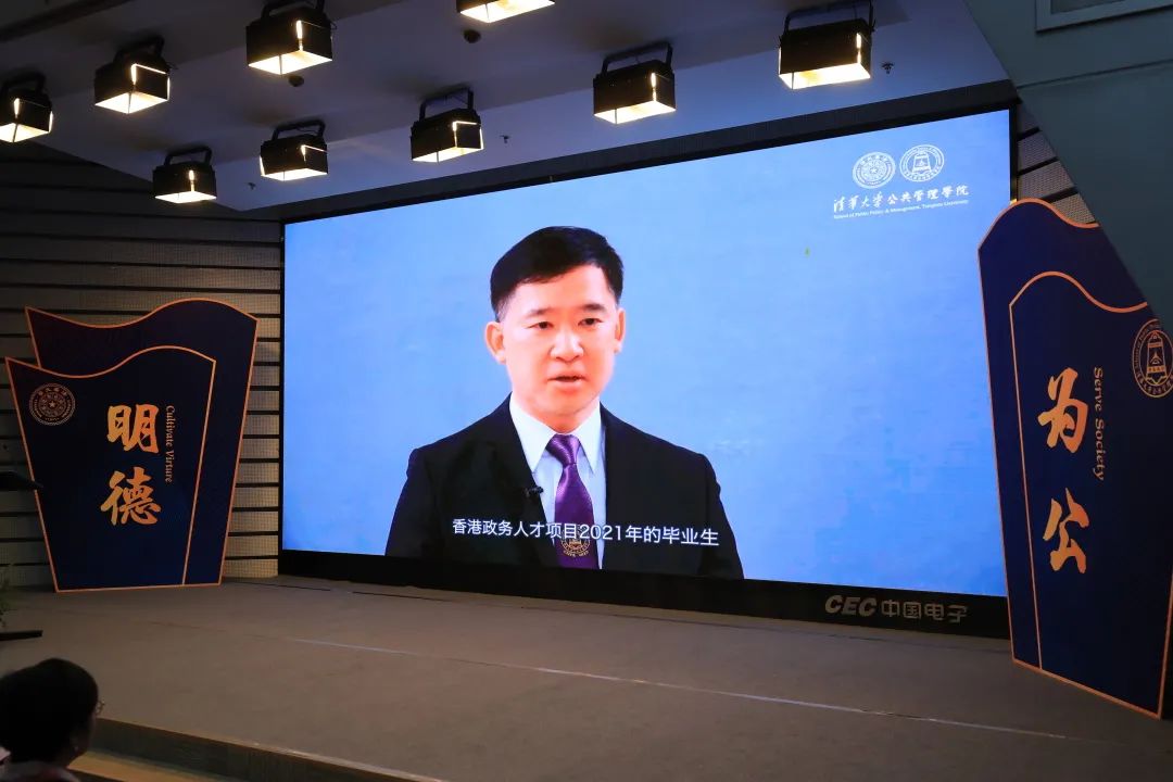 现场播放了2018级EMPA毕业生代表胡健民的发言视频。来自香港的他首先表达了对师生同学的思念和对学院悉心培养的感谢,随后与大家回忆了两年半的学习点滴和实践经历,并表示,我们会为“一国两制”的行稳致远,为中华民族的伟大复兴,贡献我们这一代清华人应有的担当。