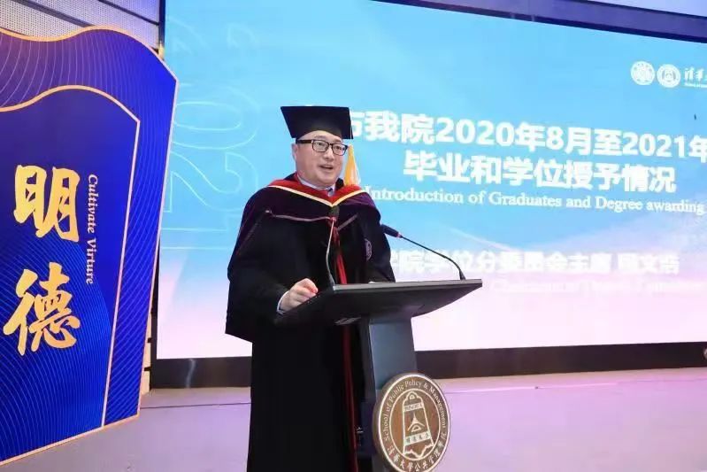 程文浩宣读了公管学院2020年8月至2021年6月毕业和学位授予情况:从去年8月至今年6月,共有403位同学顺利完成学业,获得学位。其中,管理学博士学位31人,管理学硕士学位28人,直博兼修硕士1人,公共管理硕士学位313人(含EMPA24人,国际项目留学生54人)。此外,还有30名清华其他专业的本科生获得行政管理第二学士学位。
