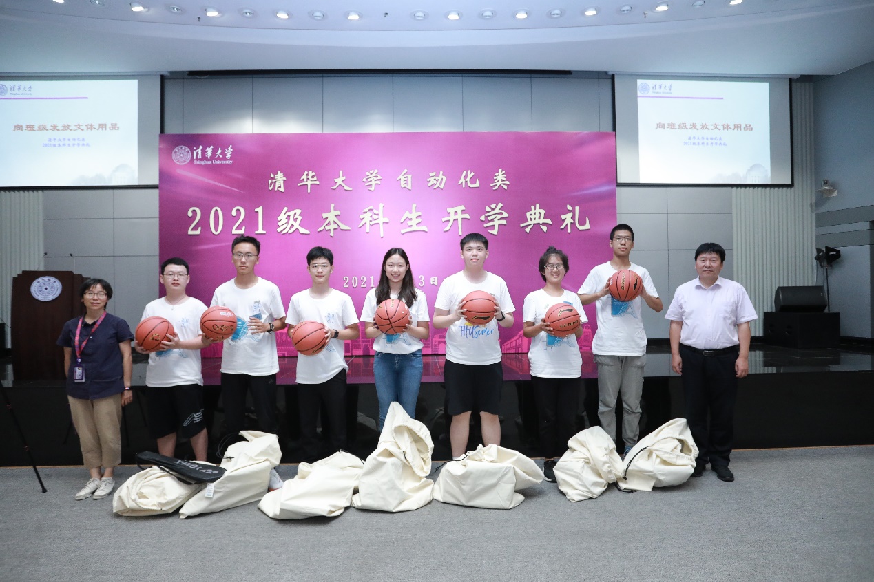 为更好地传承清华大学优秀的体育传统,鼓励新生积极参加体育运动,张涛和赵冬青向各新生班级代表发放了体育用品。在座全体人员起立齐唱校歌后,主持人宣布典礼结束。
