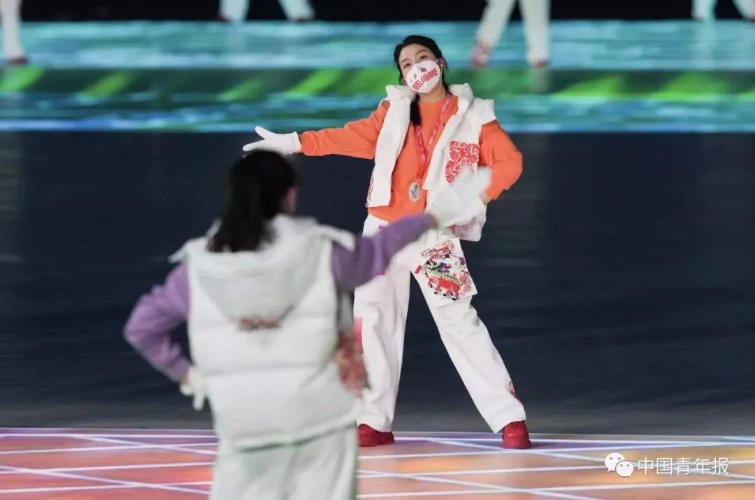 在升奥林匹克会旗环节中,清华大学社科学院2019级体育学硕士、中国花样滑冰协会主席、北京团市委副书记、中国首枚冬奥会双人滑金牌得主申雪担任旗手共同护送了旗帜。